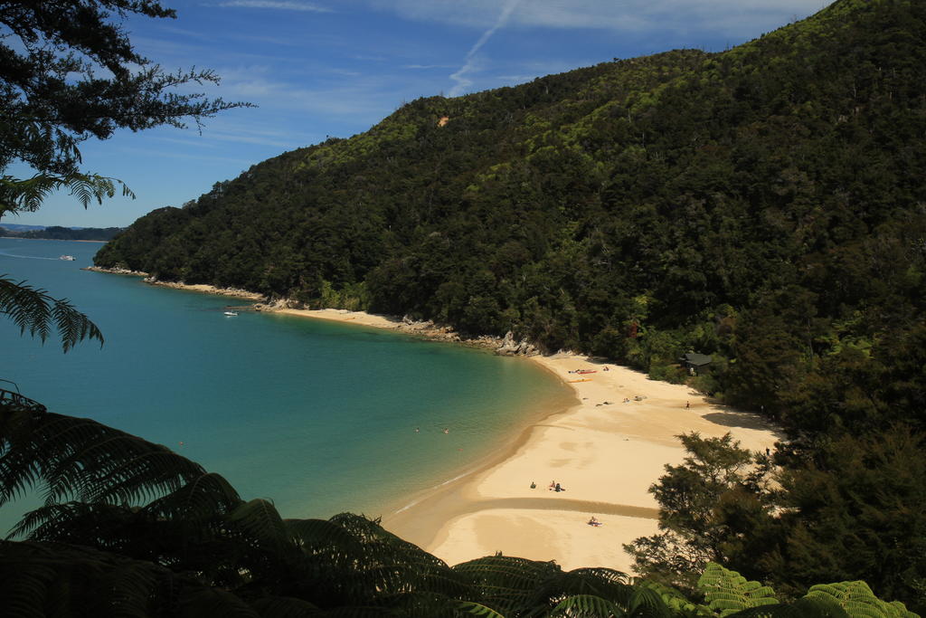 Am nächsten Tag waren wir pünktlich in Marahau zur Stelle um unser Wassertaxi zu besteigen. Genau genommen waren wir viel zu früh, aber bei gutem Wetter und schönem Strand ist das nicht allzu wild. Wassertaxi fahren läuft übrigens so: Ein braungebrannter jovialer Skipper kommt lautstark mit Trekker und Trailer zum Treffpunkt. Dort besteigt man das Boot zusammen mit ca. 18 anderen Fahrgästen und juckelt dann gemütlich, vom Traktor gezogen über Straßen und Stand zum Wasser.