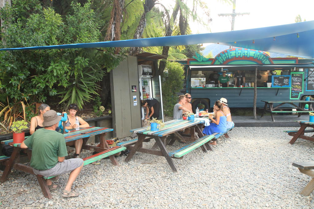 Weitere 7 oder 8 km später erreichten wir Marahau wieder und machten uns an unser nächstes Vorhaben. Julia und Dirk waren mit ihrer kleinen Tochter auch in Neuseeland und waren der Meinung, der Burger bei Fat Tui sei besser als Ferg. Das mussten wir natürlich auch Degustieren. Ein wenig überraschend tauchte der hippe Laden früher auf als erwartet und so setzten wir uns mit Sack und Pack und Wanderklamotten an einen der Tische vor dem Verkaufswagen. Die Umgebung unter dem Sonnensegel war bunt geschmückt und es tönte surfige Musik aus den Lautsprechern.